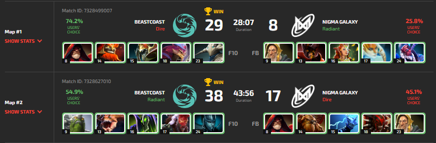 In the second game, Nigma showed some signs of life, thanks to MC's Razor, the only Nigma core having a good game. Parker's Phantom Assassin was having a good game, but Nigma won a great fight at the 32-minute mark to keep the game close. However, it turned out to be a fake comeback, as Beastcoast could close the game without too much trouble after that.