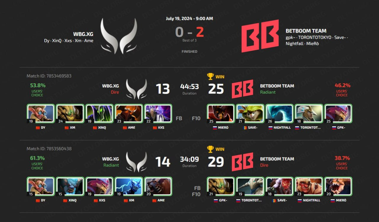BetBoom Team обыграли WBG.XG во втором раунде нижней сетки со счетом 2-0 и отправили китайский коллектив домой. WBG.XG заняли 7-8 место и заработали 200 тысяч долларов. Сегодня вечером BetBoom Team встретятся с Tundra Esports и сразятся за минимум 4 место на Riyadh Masters 2024.
