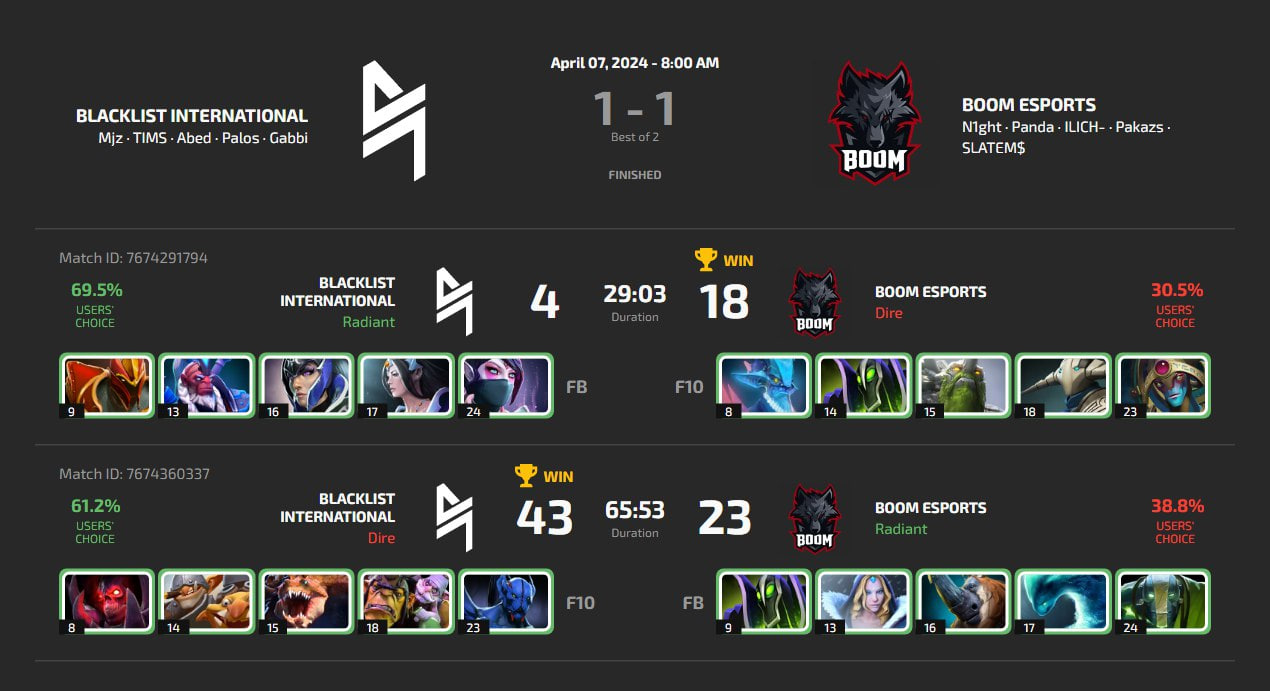Blacklist International и BOOM Esports открывали игровой день. Команды сразу задали планку, первая карта получилась легкой для коллектива Pakazs и закончилась за 30 минут со счетом 18-4. На второй карте Blacklist International отыгрались по полной, 66 минут состав Abed мучал оппонентов из Южной Америки, набирая преимущество и выигрывая все драки. Стоит отметить Pakazs, выдавшего прекрасный перфоманс - KDA 13/4/6, 52 тысячи урона и 83% участий в убийствах.
