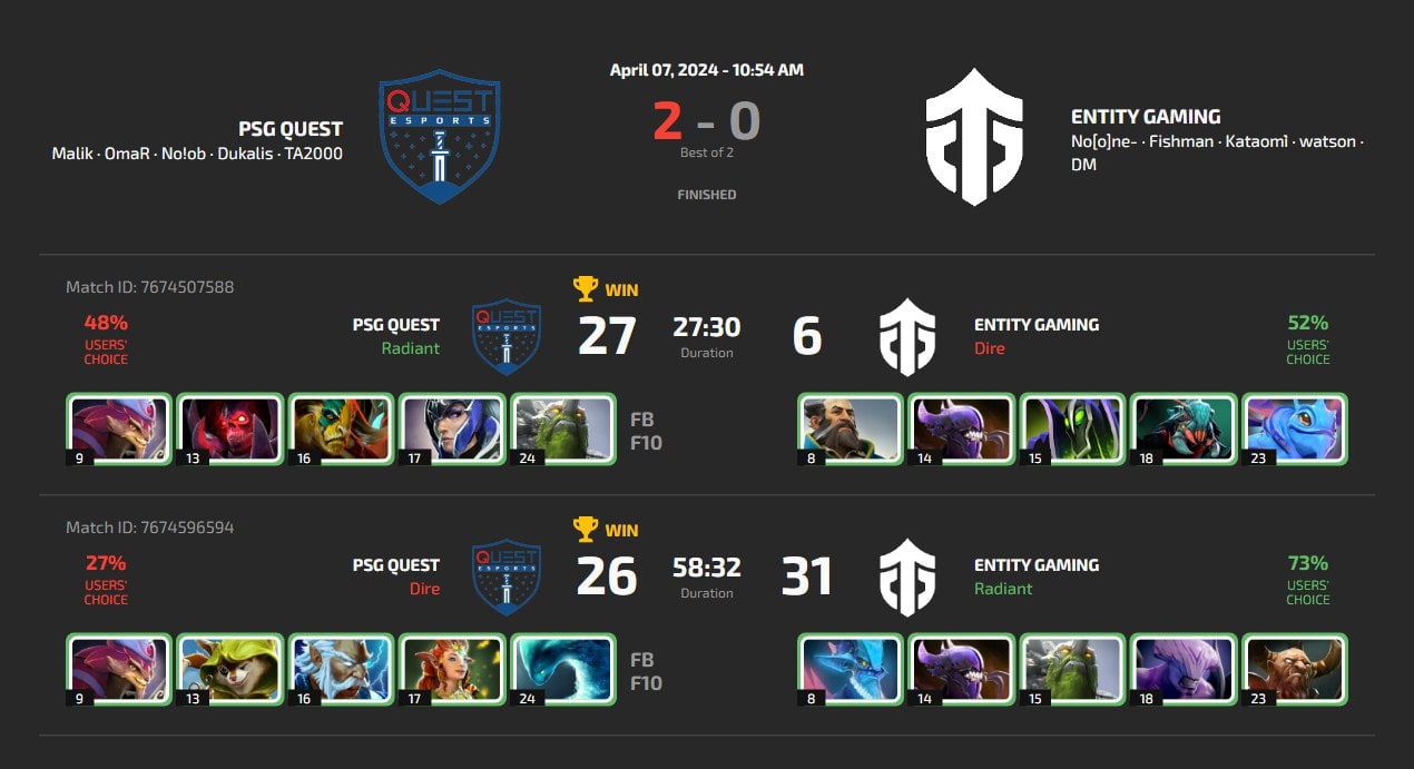 Самым интересным моментом дня оказалось завершение второй карты между PSG Quest и Entity Gaming, где MENA коллектив сломал вражеский трон, проигрывая 30 тысяч золота. Закрепить успех в матче с OG не получилось, PSG Quest безыдейно отдали две карты.