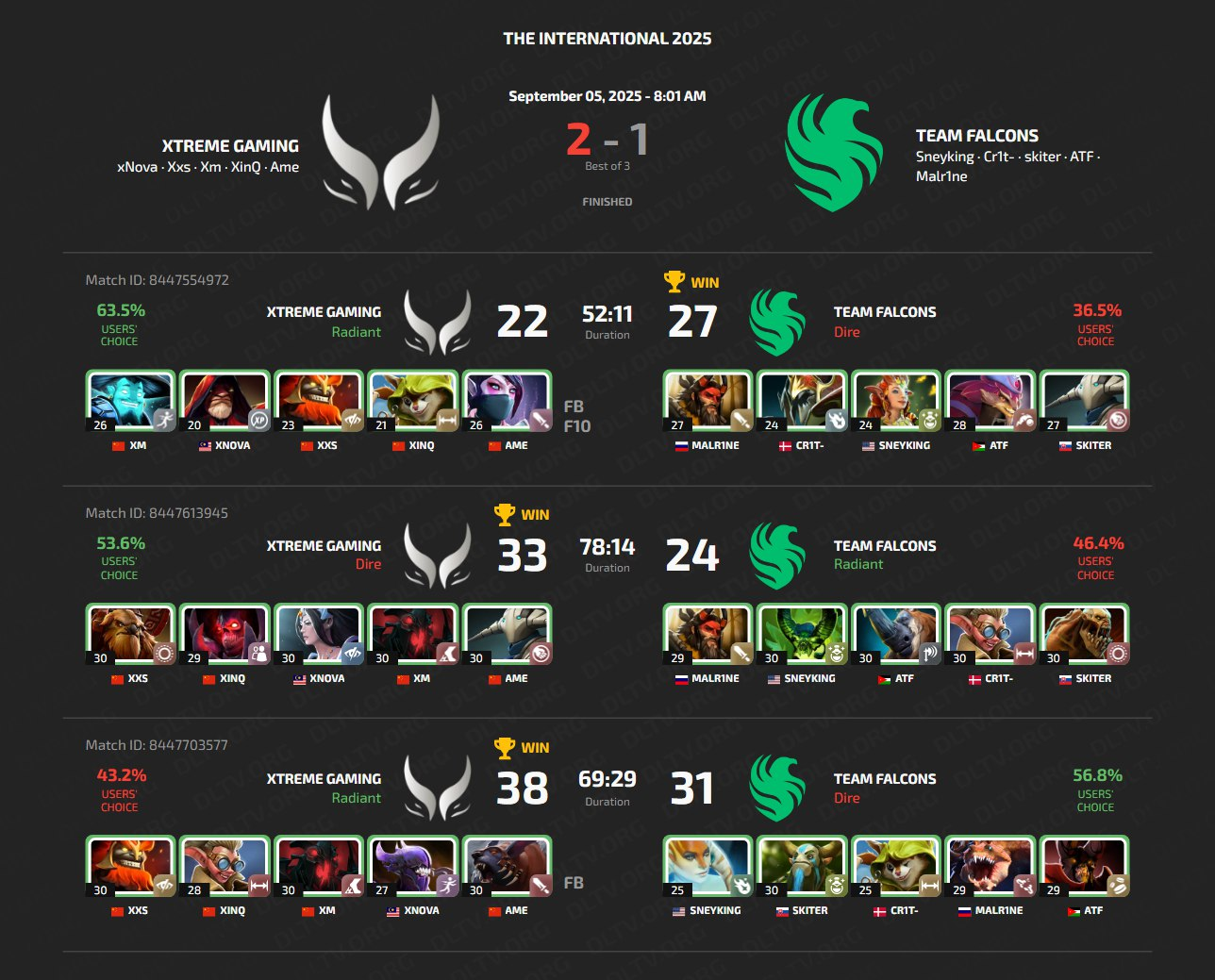 Xtreme Gaming y Team Falcons jugaron un bo3 de cinco horas, en el que Xtreme Gaming se convirtió en el ganador. Los equipos mostraron un nivel altísimo de Dota. Todos los mapas fueron muy igualados, pero los drafts de Xtreme Gaming fueron más fuertes en el late game.