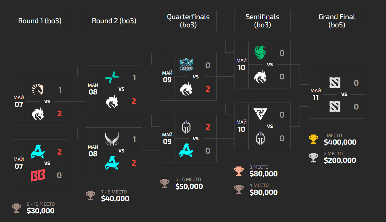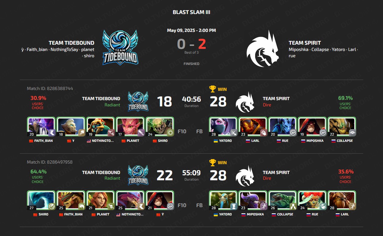 В первом матче, Team Spirit довольно легко одолели Team Tidebound. Противостояние ограничилось лишь двумя картами. На первой карте Team Tidebound выбрали для себя темповый драфт: керри Underlord, мидовый Huskar. Однако быстро завладеть преимуществом не удалось. Долго не медля, на первой минуте Yatoro и rue стянулись на мид, чтобы сделать первую кровь на Huskar, килл достался Larl, который воспользовался преимуществом и уже с третьим уровнем начал гангать линии, чтобы помочь союзникам. Преимущество Team Spirit было не критичным влоть до решившей исход игры драки на 28 минуте.