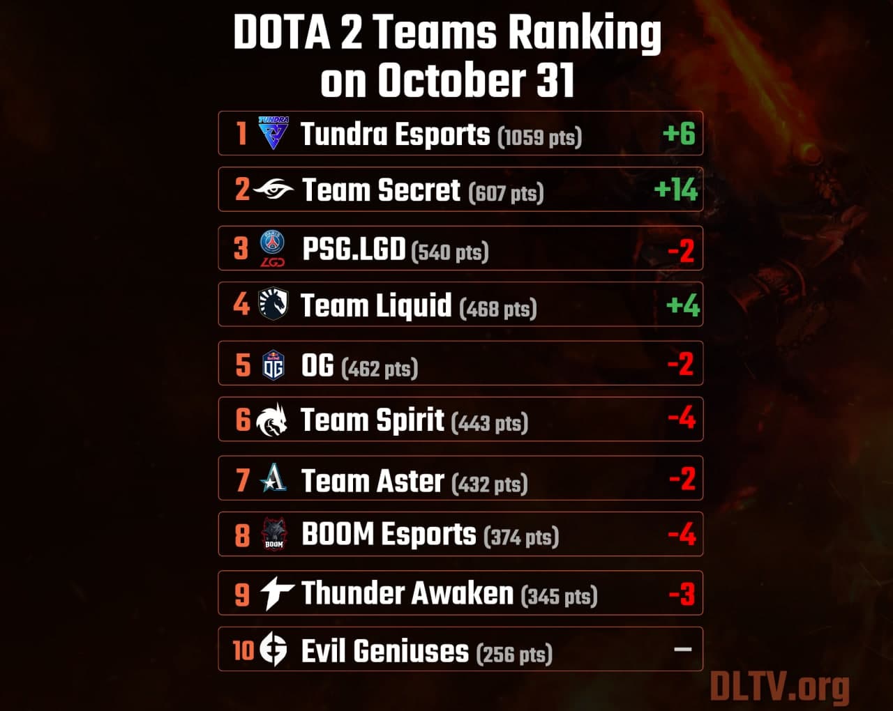 Вторую строчку рейтинга заняла Team Secret. Подопечные Клемента "Puppey" Иванова после вице-чемпионства на The International прибавили сразу 14 мест в рейтинге. По ходу чемпионата мира европейский коллектив проиграл лишь 3 матча, и все они были против Tundra Esports.