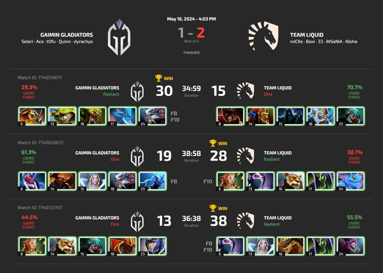 Team Liquid обыграли Gaimin Gladiators в верхней сетке плей-офф PGL Wallachia Season 1 со счетом 2-1. Победители встретятся с Team Falcons в полуфинале верхней сетки, проигравшие упали в нижнюю сетку, где сыграют с BOOM Esports на вылет. Самым ярким моментом матча стал "вдвойне бессмертный" 33 на Bristleback:
