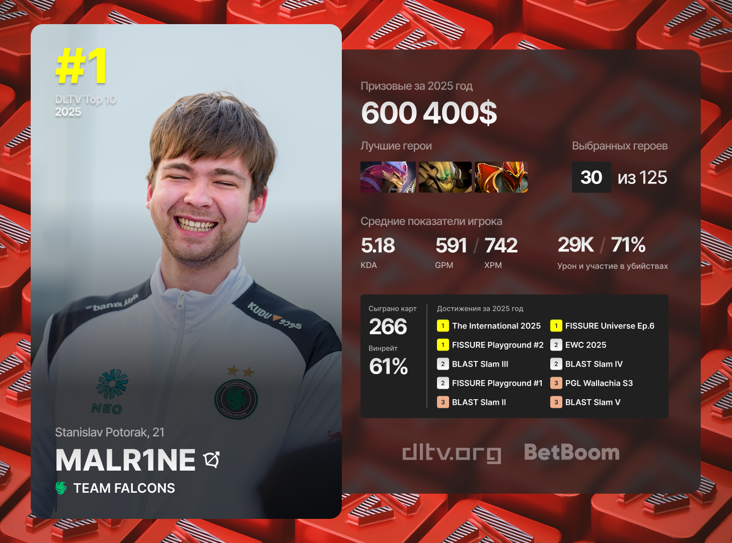 El mejor jugador de 2025 según DLTV.ORG fue el midlaner de Team Falcons - Malr1ne. En 2024 también ocupó el 1.er lugar.