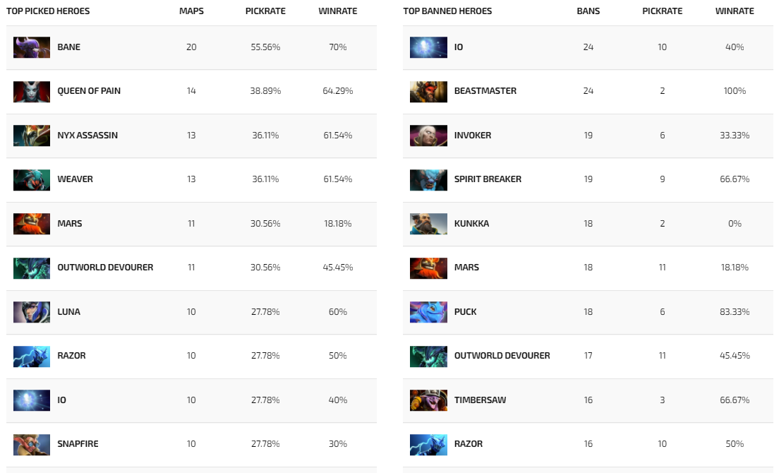 - Hero with the Highest Win Rate (over 5 maps): Bane — 70.00% WR.